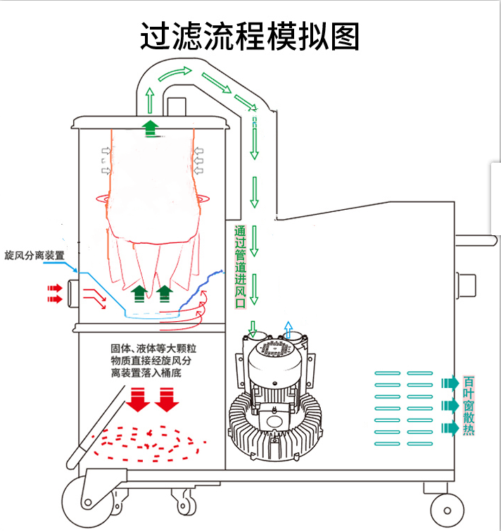 ⑥ 工廠用吸塵器動力系統(tǒng)為保證設(shè)備的高壓動力、持續(xù)續(xù)航。風機方面采用國際先進的精鑄渦輪風泵,.此款風泵采用了風冷式雙旁路(Bypass)的散熱系統(tǒng),這樣的設(shè)計可以讓電機和風泵在使用過程中一直保持恒 溫狀態(tài),使電機可連續(xù)工作24小時。 風泵進、出風口處安裝有多頻消音器,讓您有一個安靜的工作環(huán)境。電機采用國產(chǎn)西門子電機,寬壓雙頻(50/60Hz),高可靠、低噪音、長壽命。