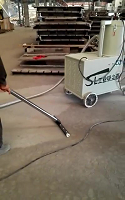 該鄭州神龍機械設備有限公司生產的SL-SZ(MC)系列大功率吸塵器產品,是可移動設備并采用真空吸附原理進行散狀物料收集,但它的最大特點是二級除塵,即旋風除塵和過濾除塵。旋風除塵器靠氣流切向引入旋風筒造成的旋轉運動,使具有較大慣性離心力,粉塵顆?;蛞旱伪凰ο蛲氨?,于氣體分開。旋風分離特別適合粉塵顆粒較粗,含塵濃度較大,高溫、固液混合條件下工作。旋風除塵是做初效過濾或預分離器使用,旋風除塵器可過濾90%以上的粉塵,使過濾式除塵器入口濃度大大降低,這樣做不但使整個設備使用壽命加長,而且在高濃度(堆積態(tài))粉料下,對于5μ粉塵(2500目)除塵效率可達99.9%,吸塵器排放效果大大提高。過濾式除塵裝置,可根據不同的客戶需求,選擇不同的過濾材料。并不是過濾精度越高越好,過濾精度高阻力也越大。向吸鋼砂、吸鐵屑就不用過高精度的濾材,以保證有足夠的吸力。我們還可以像客戶提供覆膜濾料,防水、防油。因此對高濃度粉塵以及油水混合物的清理效果非常理想。我們還可以利用設備上的旋風除塵,在鋼砂回收時,鋼砂和灰塵的比重不同,大顆粒鋼砂被旋風分離,落入旋風桶內,較輕的灰塵進入袋式除塵器,從而可實現鋼砂和灰塵分離, 該系列產品還有SL-SZ(MC)-2系列。它裝備了兩個相同功率的高壓風泵,不但設備的使用效果大大提高,而且還可根據情況,選擇單機運行和雙機運行。